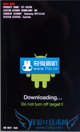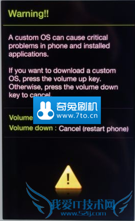 1.手机先完全的关机,然后同时按住手机的音量下键 + HOME键 + 电源键,等待3秒,出现下图界面