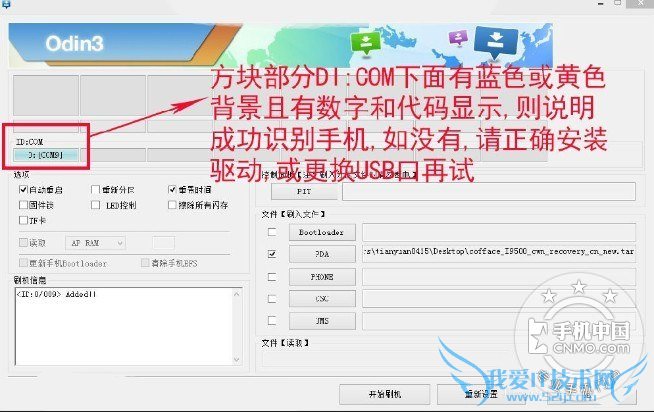 3、打开odin刷机工具,手机通过数据线连接电脑。会在odin上显示蓝色COM:XXX端口号,如果没有显示请检查驱动是否正确安装或将数据线插入主机后面的USB插口!