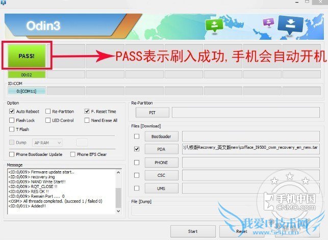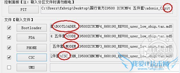 4、将下载的救砖五件套压缩包解压,里面包含五个文件,依次在ODIN里选择,pit处选择后缀为“pit”的分区文件、Bootloader选择带有“bootloader”字样的文件、PDA处选择带有“PDA或CODE”字样的文件、PHONE处选择带有“PHONE或者modem”字样的文件、CSC处选择带有“CSC”字样的文件。在选择pit文件之后重新分区的勾会自动勾选,请勿取消。全部按照默认标准。然后点击开始刷机即可,等待5-10分钟手机刷机完成后会自动重启,具体操作如图:
