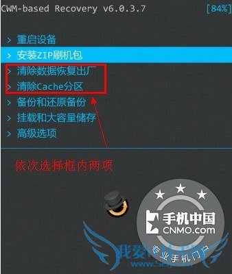 1、先将手机关机,进入recovery模式下双清(如果不能进入recovery请跳过此步骤)。操作如图: