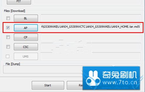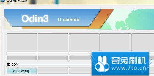 6.打开odin软件之后软件会自动识别你的手机,识别成功后会在ID:COM处显示蓝色的(表示手机连接成功了,如果没有显示蓝色的,换个usb口试试,或者看下驱动有没有安装好),然后勾选AP(旧版本的是选择PDA)选择上面下载的tar格式的刷机包。