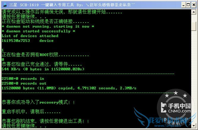 至此三星I619(Galaxy Ace Dear)第三方recovery一键刷入教程正式完结。还没有学会怎么刷入三星I619(Galaxy Ace Dear)第三方recovery的机友可以试试上面奇兔ROM市场小编给大家分享的这篇三星I619(Galaxy Ace Dear)第三方recovery一键刷入教程。