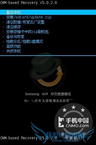 9.完成后退出,按上面进入三星I619(Galaxy Ace Dear)Recovery的方法进入,看一下你的Recovery是不是变成中文了?功能强大了啊?那么恭喜你,你成功了。