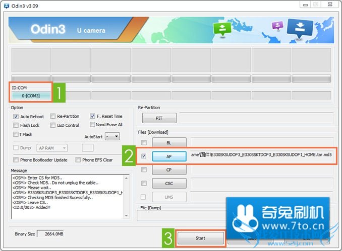 确认手机是否连接如下图; 点击 AP 按钮,选择固件文件夹下的 E330SKSUDOF3_E330SSKTDOF3_E330SKSUDOF1_HOME.tar.md5 ;