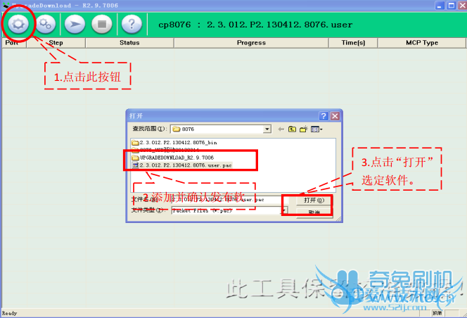 1.运行“"Coolpad8076升级工具\升级工具_R2.9.7007\UpgradeDownload.exe" ”,开启升级平台;