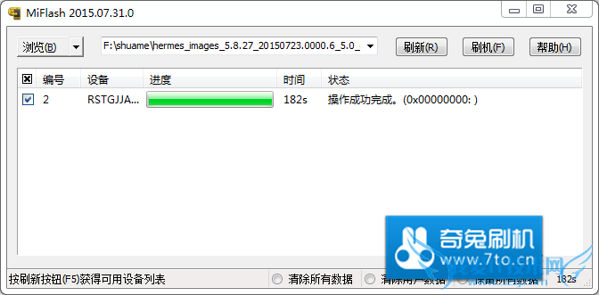 刷机过程大概3分钟左右,中途进度条可能没有反应,需要耐心等待,刷机完成如下: