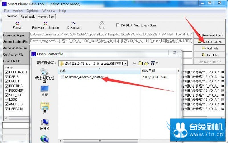 3.把下载好的工具解压,打开里面的Flashtool,选择“Scatter-loading”,再选择刷机包里面的MT6582文件,如图
