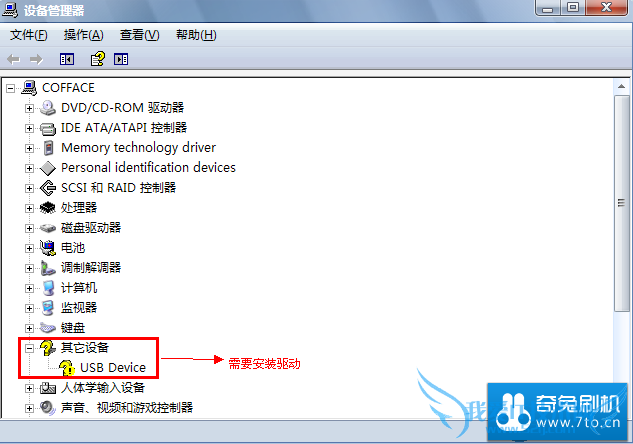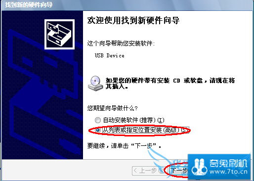 手机处于关机状态,按住camara键并插入USB线,此时PC端会弹出以下对话框,同时设备管理器中会找到新硬件:
