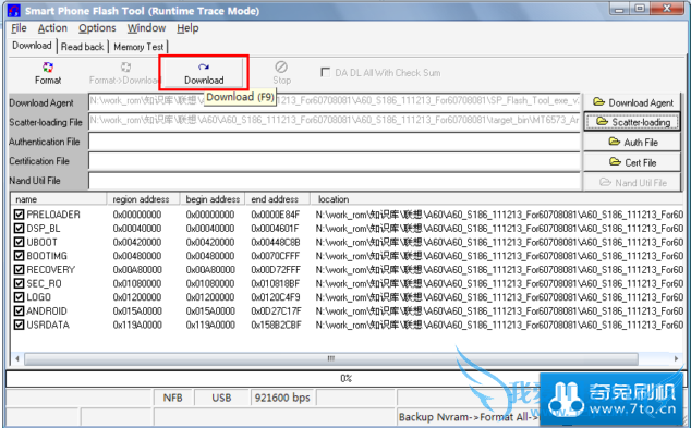 7.设置完成Scateer file文件后,单击Download 即可进入下载,进度条开始滚动,下载过程包括5个阶段。