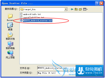 6:然后在刚才解压出来的target_bin文件夹中选择MT6572_Android_scatter.txt(注意:这个文件的名字不同的固件有所不同)