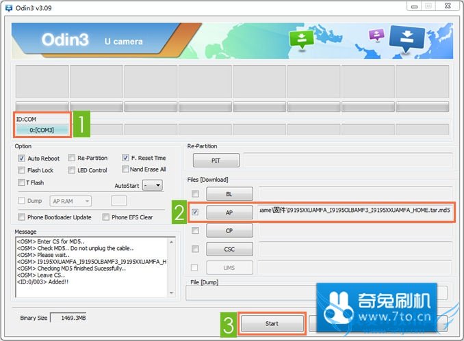 运行刷机工具 Odin3.09.3.exe手机进入挖煤模式后连接电脑,odin工具的com如下图1表示驱动正常;
