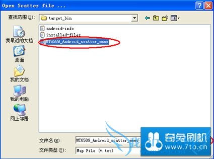 6:然后在刚才解压出来的target_bin文件夹中选择MT6589_Android_scatter_emmc.txt(注意:这个文件的名字不同的固件有所不同)