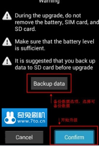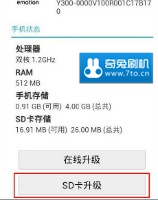 SD卡插入手机开机,按Menu键,选择“系统更新 ->SD卡升级 ->确认 -> 升级”,如需备份数据,请选择备份数据,之后开始升级