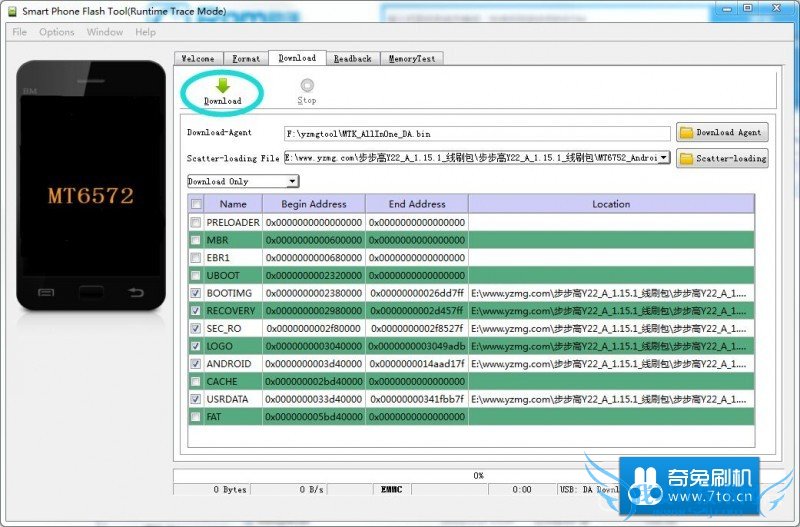 5.然后点击“Download”,再把手机连接到电脑,接下来等待自动刷机,出现绿色圆圈就说明步步高vivo Y22(移动版)救砖成功了!