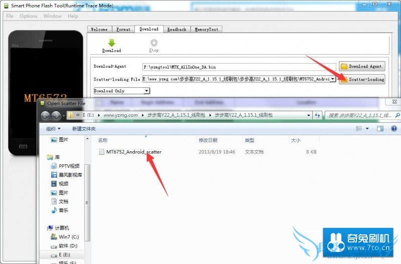 4.打开下载的步步高vivo Y22(移动版)刷机工具,选择“Scatter-loading”,再选择线刷包里的MT文件,如图
