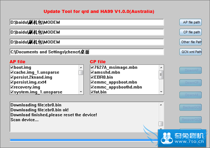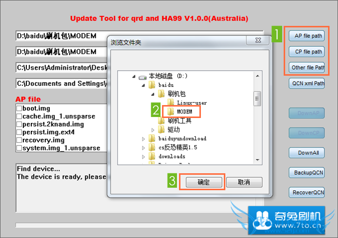 2.选择刷机文件的路径。前面三个按钮点击之后都指向modem(下载的固件包文件)文件夹