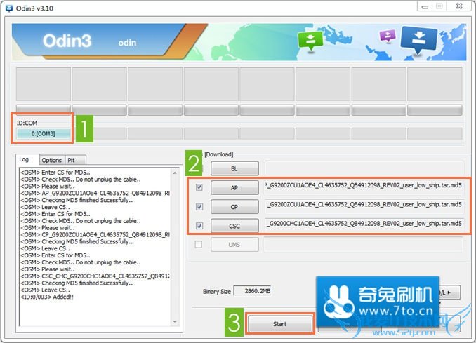 点击 CP 按钮,选择固件文件夹下的 CP_G9200ZCU1AOE4_CL4635752_QB4912098_REV02_user_low_ship.tar.md5 ;点击 CSC 按钮,选择固件文件夹下的 CSC_CHC_G9200CHC1AOE4_CL4635752_QB4912098_REV02_user_low_ship.tar.md5 ;