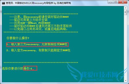 5..然后再选择刷入第三方recovery的工具界面下,输入键盘数字1【1、刷入第三方recovery,无限制刷任何ROM包】,如下图;