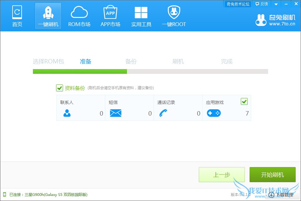 2.点击【一键刷机】,可以选择你要刷的三星G900h (Galaxy S5 双四核国际版) ROM包,如果你还没有下载手机相关刷机ROM包,可以在奇兔刷机ROM市场下载。选择好手机的刷机ROM包之后,进入资料备份界面,刷机会清除联系人, 短信, 通话记录和应用程序,建议大家备份,刷机后可以还原。