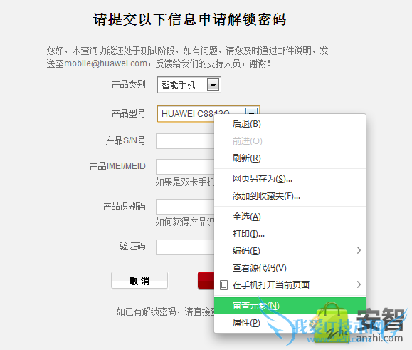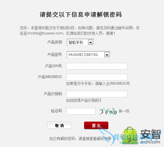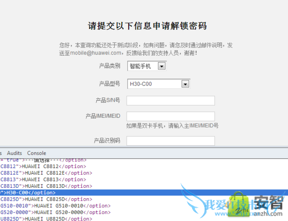 1、华为荣耀3C/H30-C00 1G电信版申请解锁码网址:http://www.emui.com/plugin.php?id=unlock