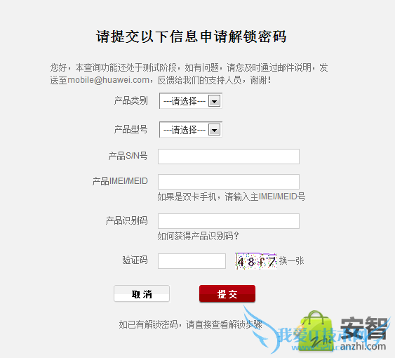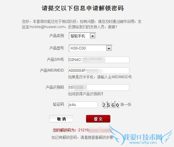 8、随后关闭浏览器下方的界面,仔细认真填写产品S/N号、产品IMEI/MEID、产品识别码,验证码填写正确,点击“提交”,瞬间获取解锁码;如图所示: