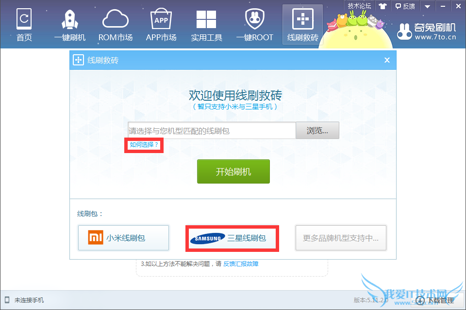 这时候弹出“欢迎使用线刷救砖”提示,不知道如何选择正确的线刷包的用户,可点击“如何选择?”进入相关教程贴学习,三星手机用户可直接选择三星线刷包。