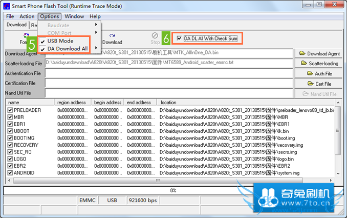 3.确保 USB Mode、DA Download ALL 和 DA DL All With Check Sum这3个选项勾选
