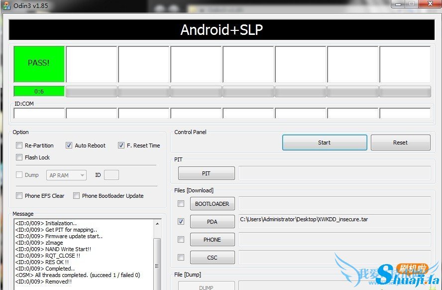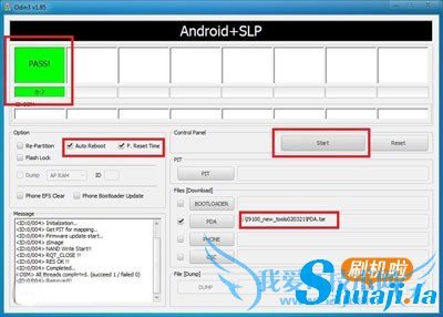 4.点击PDA,选择刚下载的recovery-clockwork-4.0.1.4-galaxys2.tar的位置,然后确保只有3个位置是打开勾,如上图所示.然后就可以点击Start