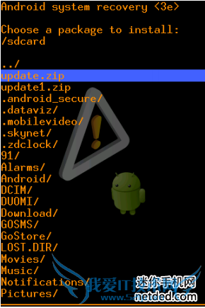 7:然后在出现的列表中选择“update.zip”文件,然后按开机键进行确认,之后就开始刷机了