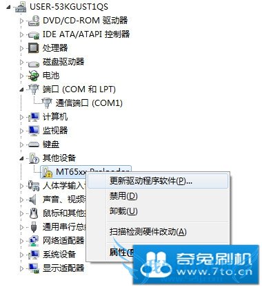 3.此时设备管理器会出现一个带问号(或者感叹号)的设备,对其右击“更新驱动程序”