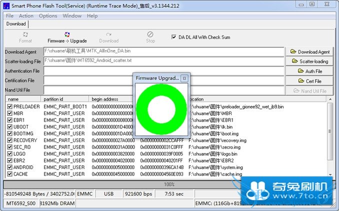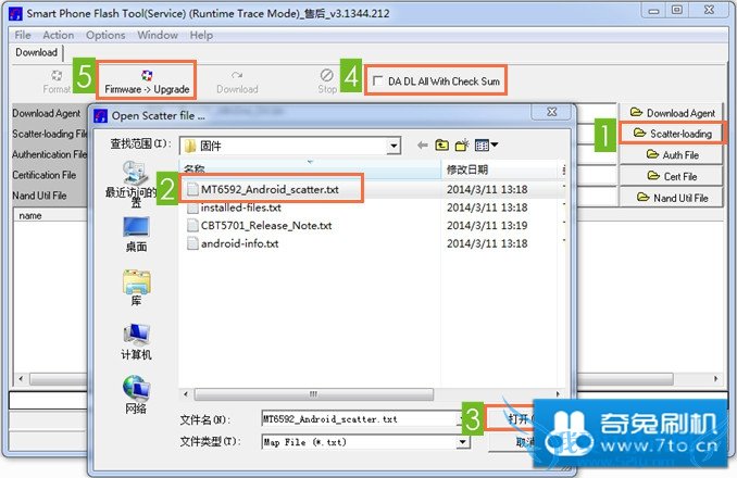 2.选择 固件 文件夹下的相关文件,勾选 DA DL All With Check Sum,点击"Firmware -> Upgrade"