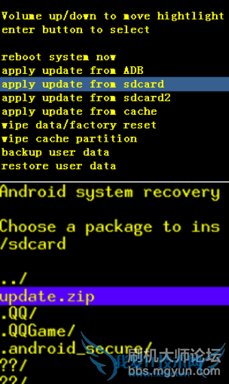 6:按侧键移动,按照SD 卡包的实际存放位置,移动至【apply update from sdcard】中,使用电源键确认,进入t卡目录后选择你下载的升级包update.zip。选择update.zip 按电源键开始升级。