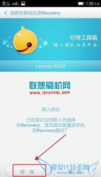 5.刷好recovery以后如果页面有安装软件的提示,请点击忽略,当出现“是否重启进入recovery”提示后,这里要点击“取消”然后退出工具箱,(此时不要选“重启”,要选择“取消”),如下图: