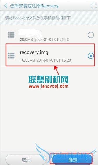 4.我们选择我们刚刚放在SD目录下的“recovery.img”文件,点击后会提示“是否选择刷入recovery”,点确定。如下图: