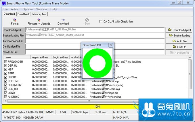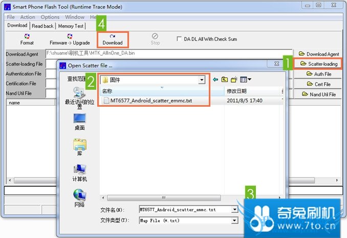点击 Scatter-loading ,选择 固件 目录下的 MT6577_Android_scatter_emmc.txt ,并点击 Download 如下图:
