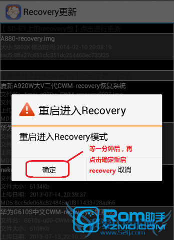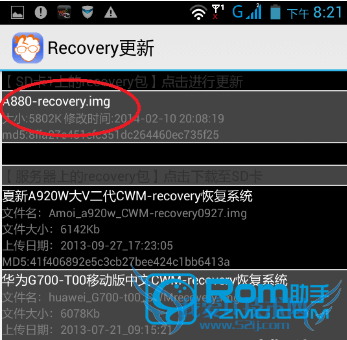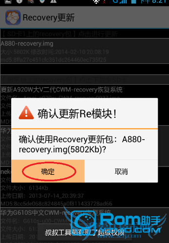6.如果您已经将【A880-recovery.img】文件复制到了手机SD卡上的话,那么,此时软件列表里就应该会显示【A880-recovery】,直接点击并且确认更新;