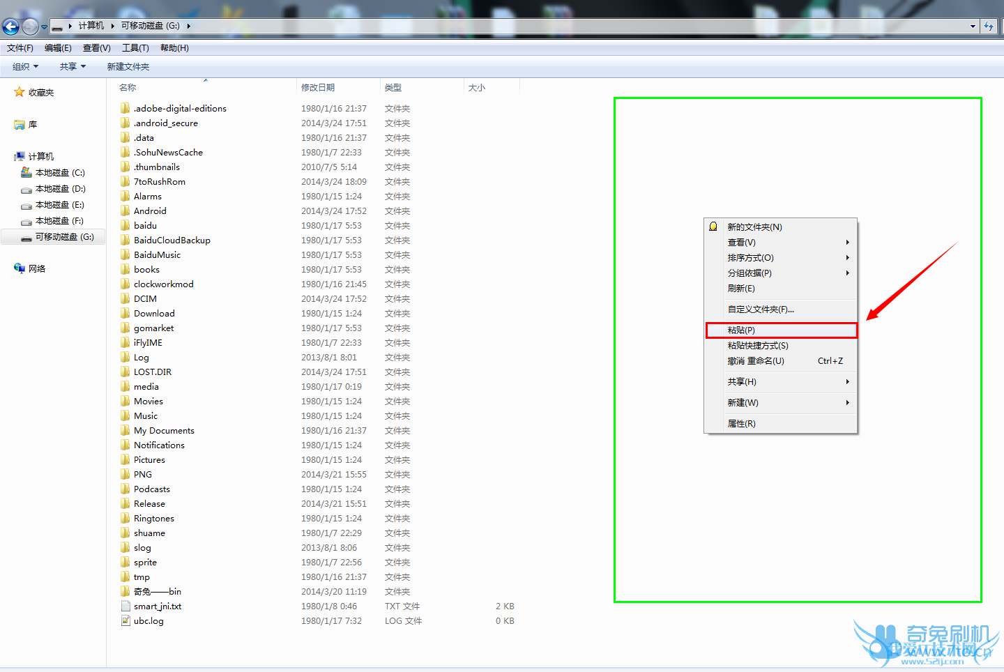 7:点击右边空白的地方,不要点中任何文件夹,右键选择【粘贴】,把刚才复制的dload文件夹粘贴到内存卡根目录。一定要根目录,一定不能进入任何文件夹内!