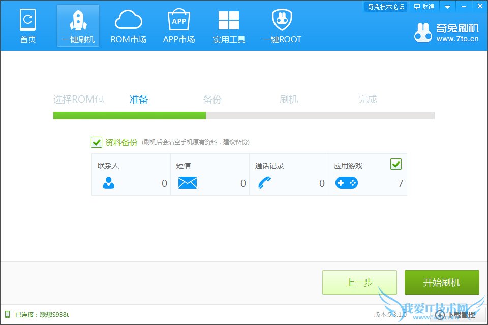 2.点击【一键刷机】,可以选择你要刷的联想S938t ROM包,如果你还没有下载手机的刷机ROM包,可以在奇兔刷机ROM市场下载。选择好手机的刷机ROM包之后,进入资料备份界面,刷机会清除联系人, 短信, 通话记录和应用程序,建议大家备份,刷机后可以还原。