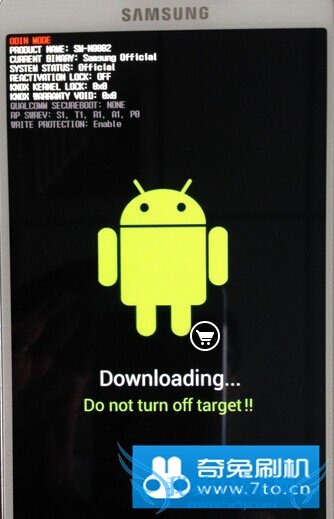 4.手机进入刷机模式,进入方法(关机状态下同时按住 音量下、HOME键、电源键,屏幕亮起放开,然后再按音量上键,进入界面为绿色机器人,此为刷机模式)