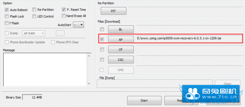 7.以上都准备好之后,点击start开始刷入,上面会显示“PASS”字样就表示三星A5009(Galaxy A5 电信版)刷入recovery成功了!