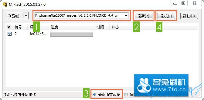 安装完成后,打开 “我的电脑” C:\Program Files (x86)\Xiaomi\MiPhone\MiFlash.exe, 将复制的内容粘贴到下图步骤1区域位置,按照下面操作: