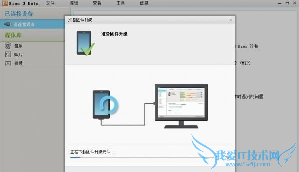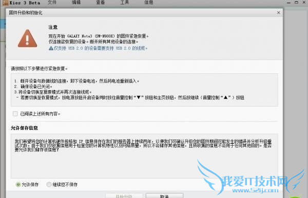 6、“准备固件升级”成功后会如下图所示。这时手机关机状态下同时按住音量下键+home键+电源键,进入download模式,进入后按一下音量上键,进入到恢复模式(Odin模式),然后插上USB连接电脑。把下图中“已阅读上述所有内容”打钩。这个时候你会看见原本灰色的“开始升级”按钮亮起来了。点击“开始升级”,耐心等待,这里完全看你的网速快慢了。升级成功后按照提示操作就可以了。