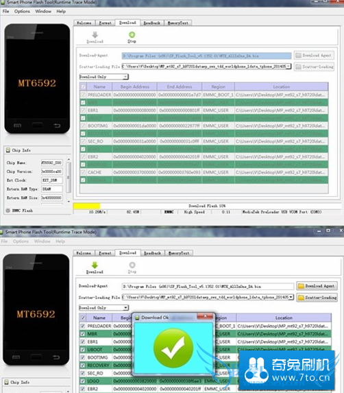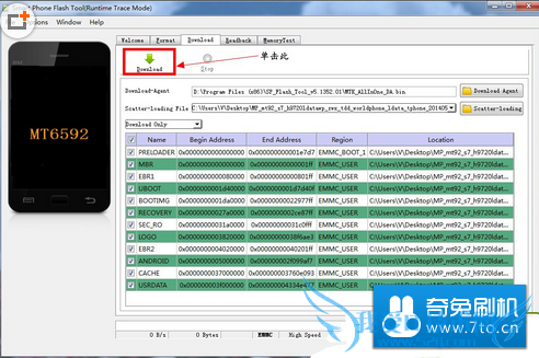 2、选择txt文件以后软件会出现很多分区准备信息,我们继续点击【Download】,软件会等待手机连接;此时我们手机在关机状态下通过数据线连接手机(如果是台式机最好将数据线连接在主机箱后面的USB接口),软件识别手机后会自动进行刷机升级。