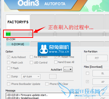 4:打开odin软件之后软件会自动识别你的手机,识别成功后会在ID:COM处显示蓝色的(表示手机连接成功了,如果没有显示蓝色的,说明没有有连接好),然后勾选AP,选择上面下载并解压出来的tar或md5格式的文件包。