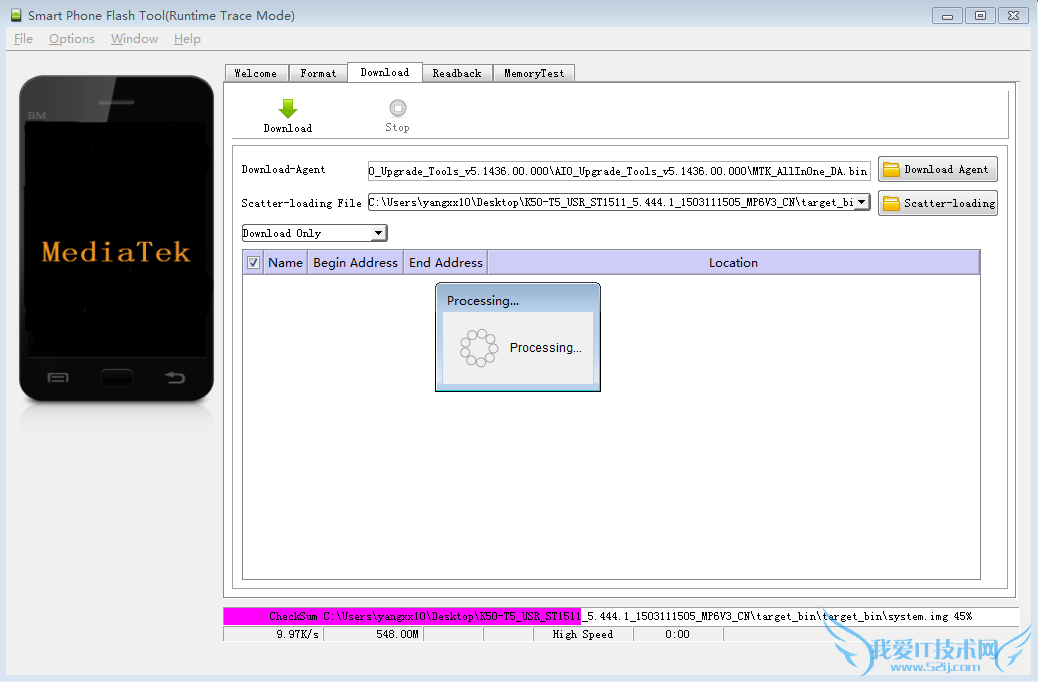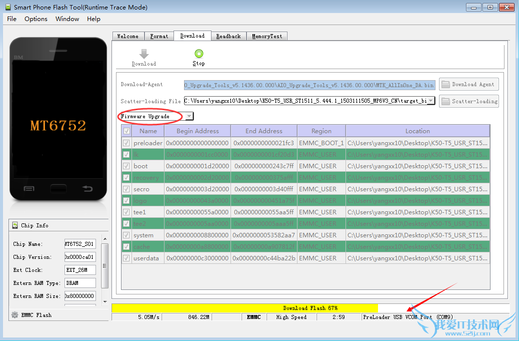 6.图中画圈位置选择“Firmware Upgrade”,点击Download,手机关机,拔下电池后连接电脑,三秒后插上手机电池,可以看到下面的滚动条开始滚动,刷机开始