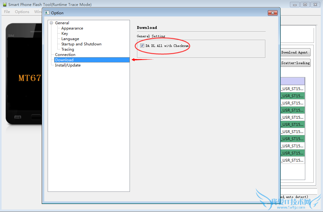 3.点击Option,在弹出选项中选择Download,在弹出的选框中勾选“DA DL All with Checksum”