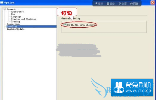 4.选择的文件加载完成后,继续在菜单上选择 “Options” , “Download”,勾选 “DA DL All With Check Sum” enable!!如下两张图所示: