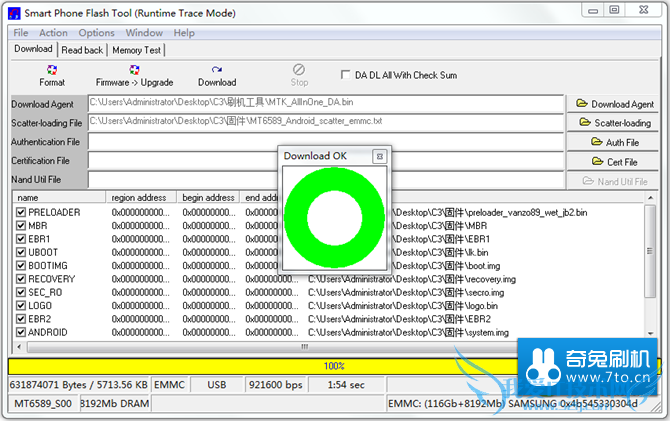 2.选择 固件 文件夹下的相关文件,点击"Download",此时刷机工具会出现粉红色的进度条,待进度条走完后再继续下一步。