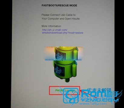 3.进入华为Y635-CL00电信4G版解锁需要的模式,把手机关机,然后在关机状态下,按住音量下键和开机键不放保持10秒,直到进入了白屏的fastboot模式后松手,再把手机连接上电脑。如下图: