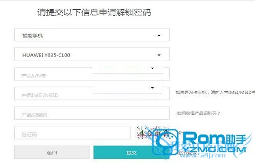 2.选择上方的“智能手机”,再选择“Y635-CL00”,如上图:按提示填写好相关的识别码什么的,再点击“提交”按钮,会返回一个解锁码,然后保存好它